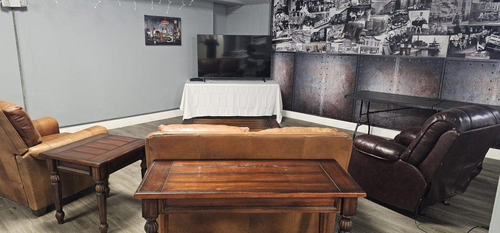 What truly sets our space apart is the built-in entertainment area featuring comfortable couch and recliner seating arranged around a large screen TV. This setup proves ideal for Super Bowl parties, viewing celebrations, or simply providing a relaxed lounge space where guests can take a break from the main festivities. For business gatherings, the screen works well for presentations or video conferences.