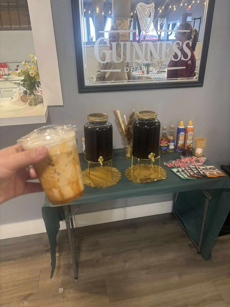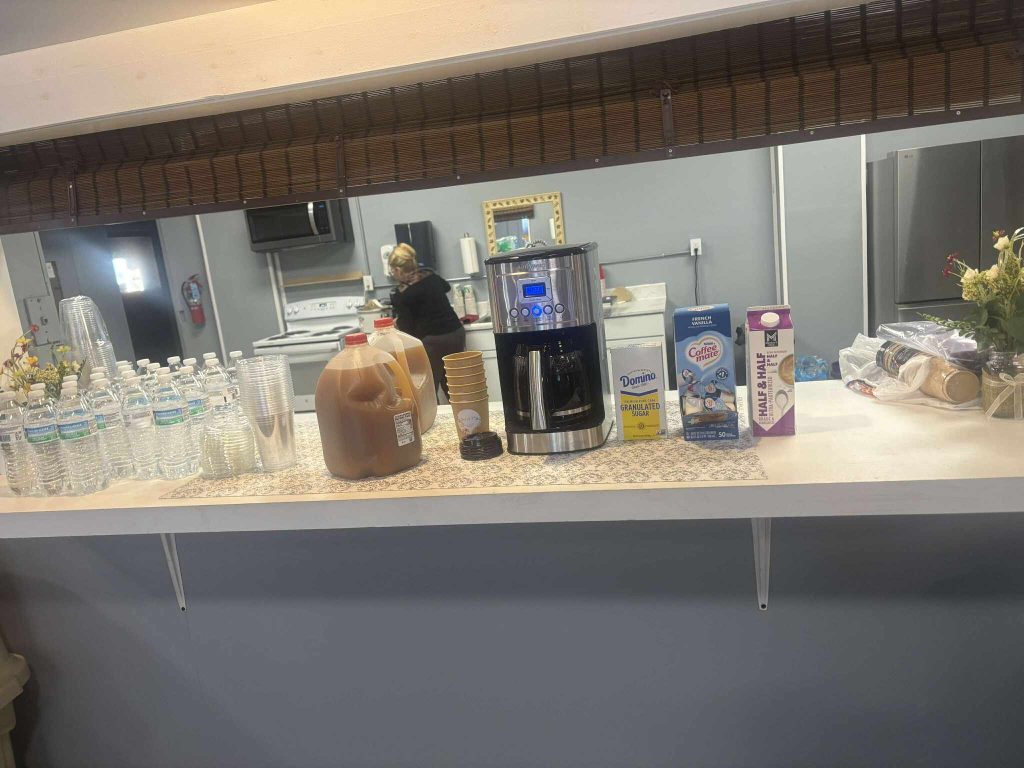 Unlike many rental spaces that leave you scrambling to figure out food service logistics, our venue includes a fully functional kitchen equipped with a refrigerator and stove. The serving window creates an efficient flow for buffet-style service, while our 18-foot table setup provides ample space for food and beverage displays. Whether you’re bringing in catering, preparing food yourself, or having guests contribute potluck style, you’ll have everything you need to keep your guests well fed throughout your event.