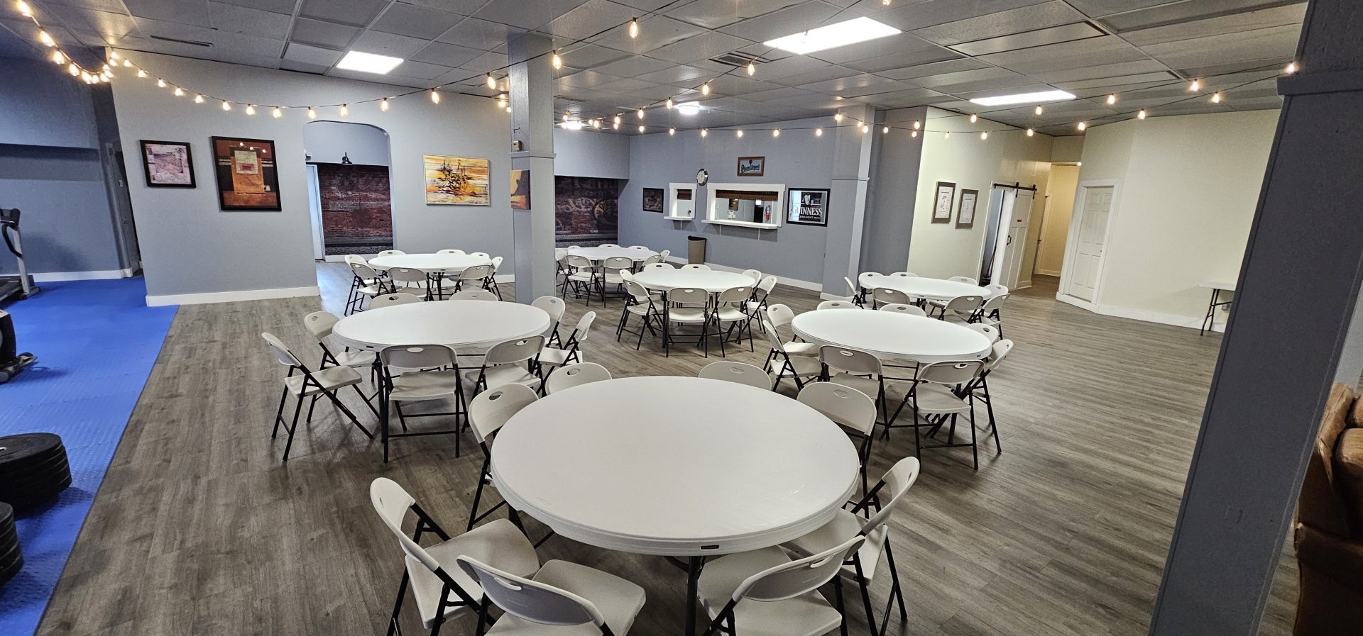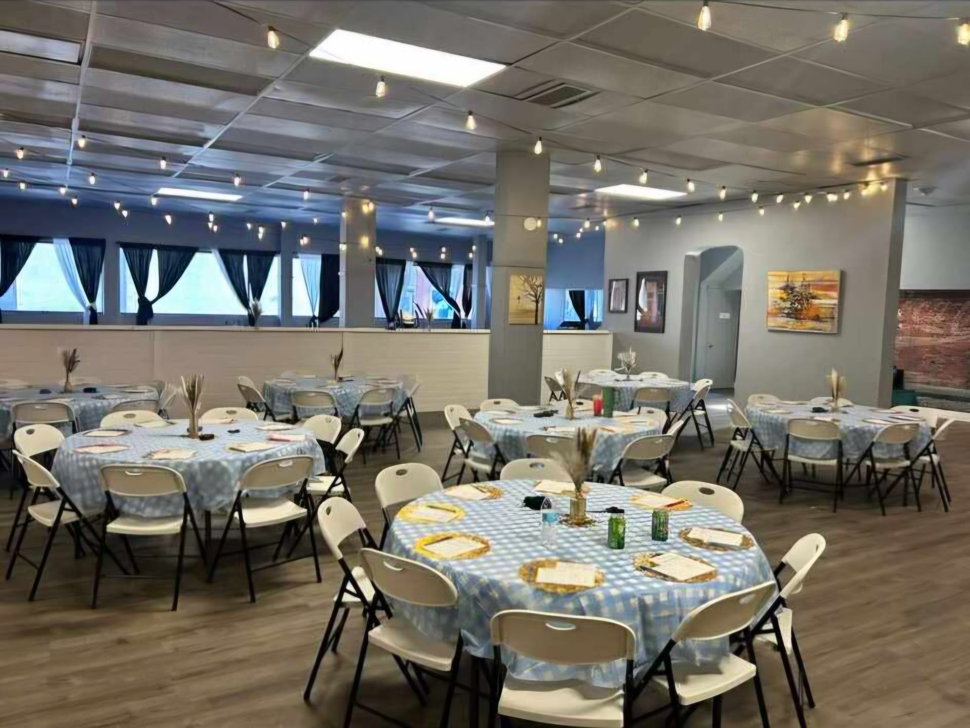 Our main room offers over 3,000 square feet of open space that adapts to your specific needs. Currently configured with seating for 80 guests at 10 large round tables, the layout works perfectly for sit-down dinners, shower games, or meeting presentations. Need a dance floor for your celebration? We can adjust the configuration to create space for dancing while maintaining comfortable seating for your guests. This flexibility means you’re not locked into someone else’s idea of how your event should look.